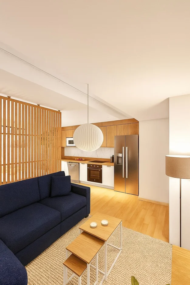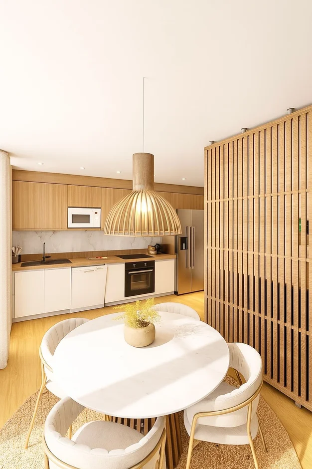 Added a vertical slatted wood divider that subtly separates the dining area from the living room without blocking light or disrupting openness. This architectural detail provides both style and function, enhancing texture and depth in the overall design. -