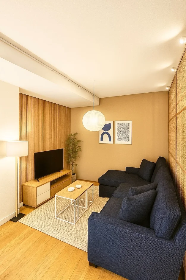Furnished the living room with a deep navy sectional sofa, minimalist wooden furniture, and textured textile elements. This blend of soft neutrals with a bold accent color establishes visual balance and brings comfort and sophistication into the relaxation zone. -