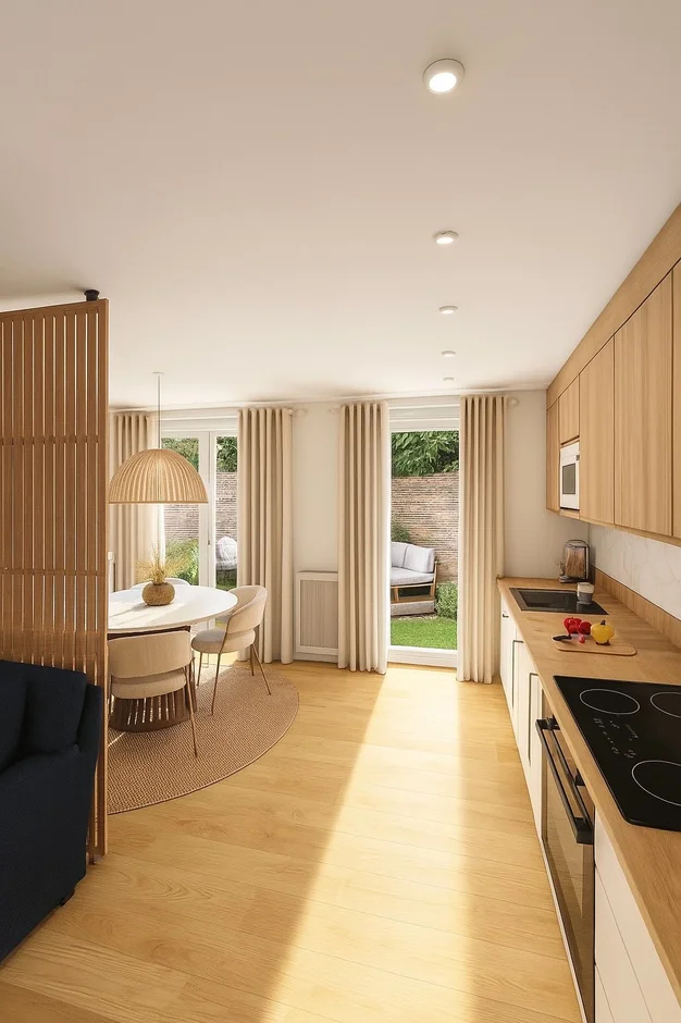 Installed a streamlined kitchen with handle-free cabinets, a warm wooden countertop, and a marble-effect backsplash. This clean, functional layout offers ample storage, integrated appliances, and generous workspace while maintaining a visually calm presence within the open-plan room. -