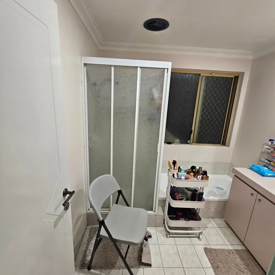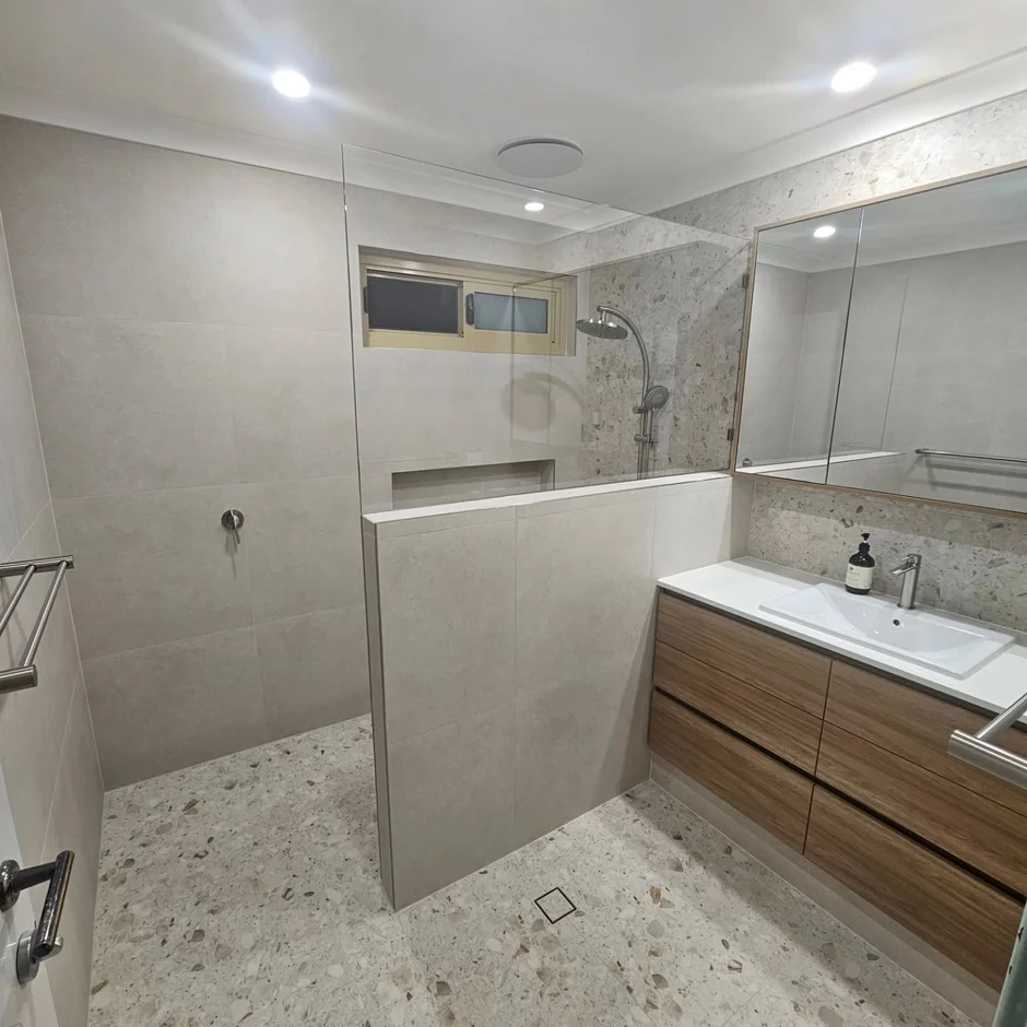 Installed a spacious walk-in shower with a frameless glass panel, linear drain, and a built-in shower niche for a clean, open feel. -