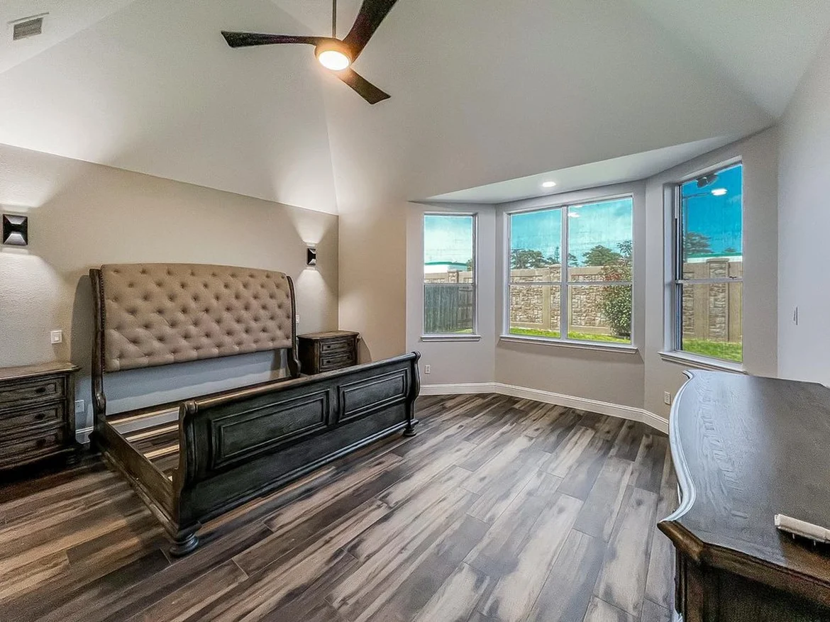 The master bathroom was completely renovated, including the replacement of the old vanity and fixtures with custom dark cabinetry and quartz countertops. A new walk-in shower with modern black fixtures, mosaic tilework, and a frameless glass enclosure was installed to enhance both style and comfort.