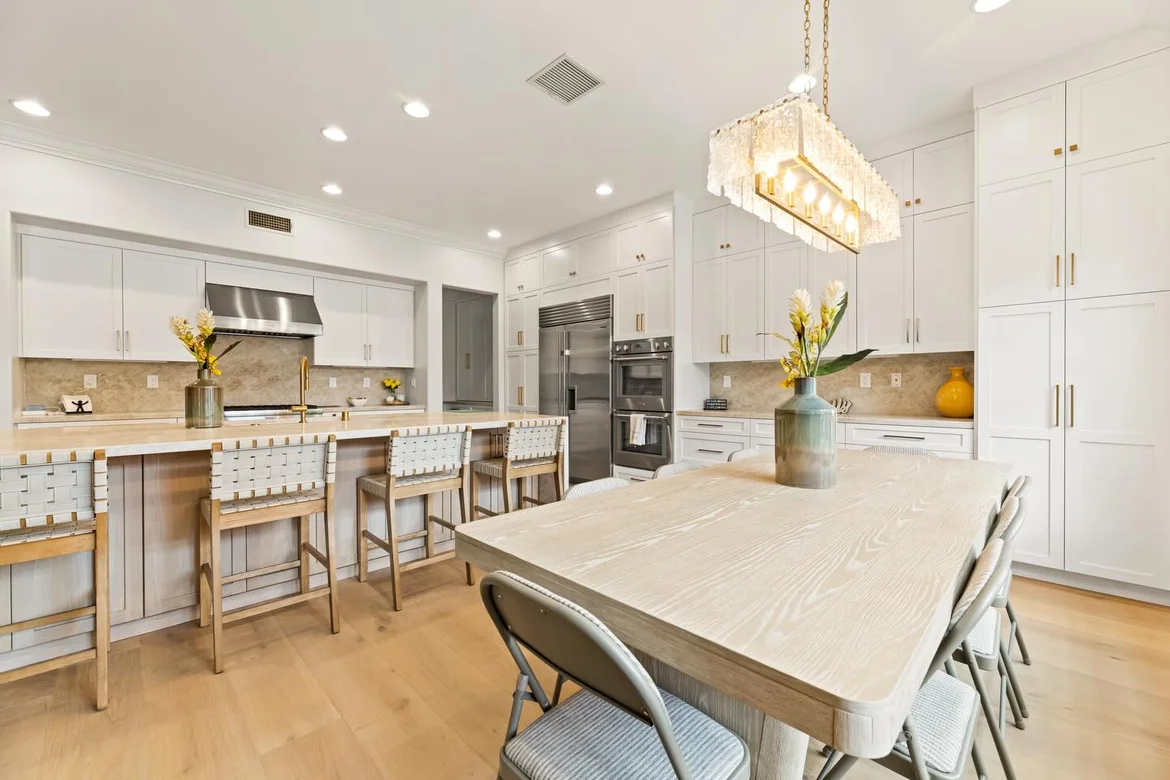 Seamlessly integrated stainless steel appliances, including a professional-grade range, custom ventilation hood, built-in oven, refrigerator, and dishwasher for a clean, unified look. -