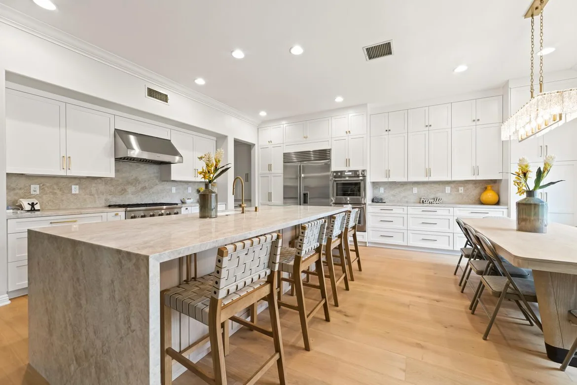 Built a large central island with integrated storage and bar seating, serving as a multifunctional area for food preparation, casual dining, and entertaining. -