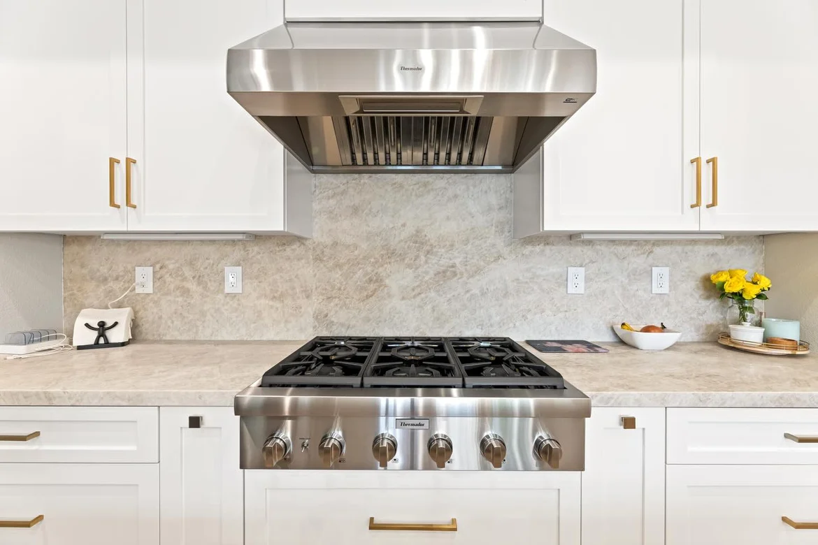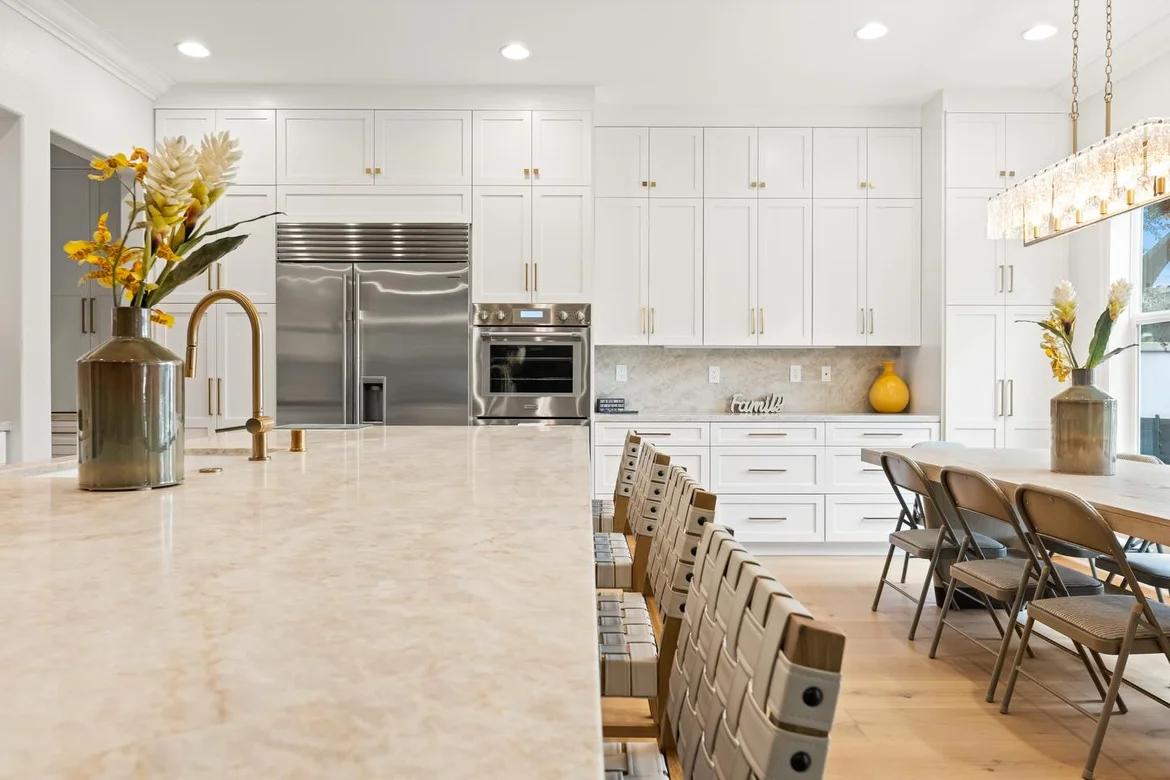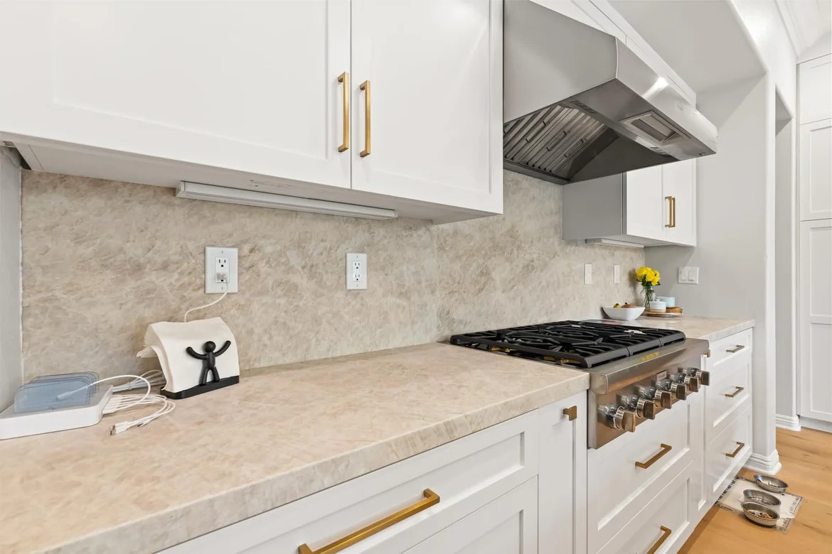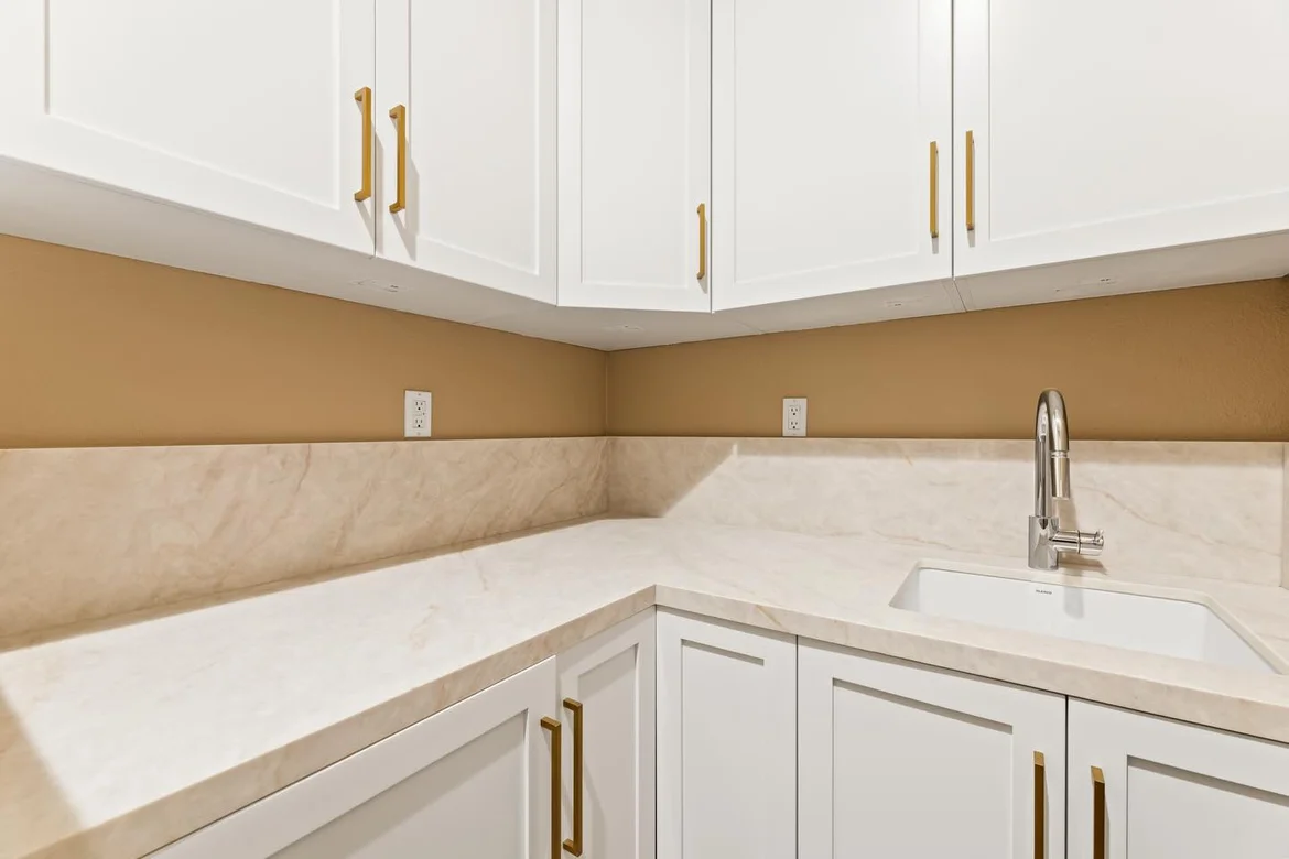 Finished all work surfaces with durable quartz countertops and a continuous stone backsplash, delivering a seamless, easy-to-maintain surface that elevates the overall aesthetic. -