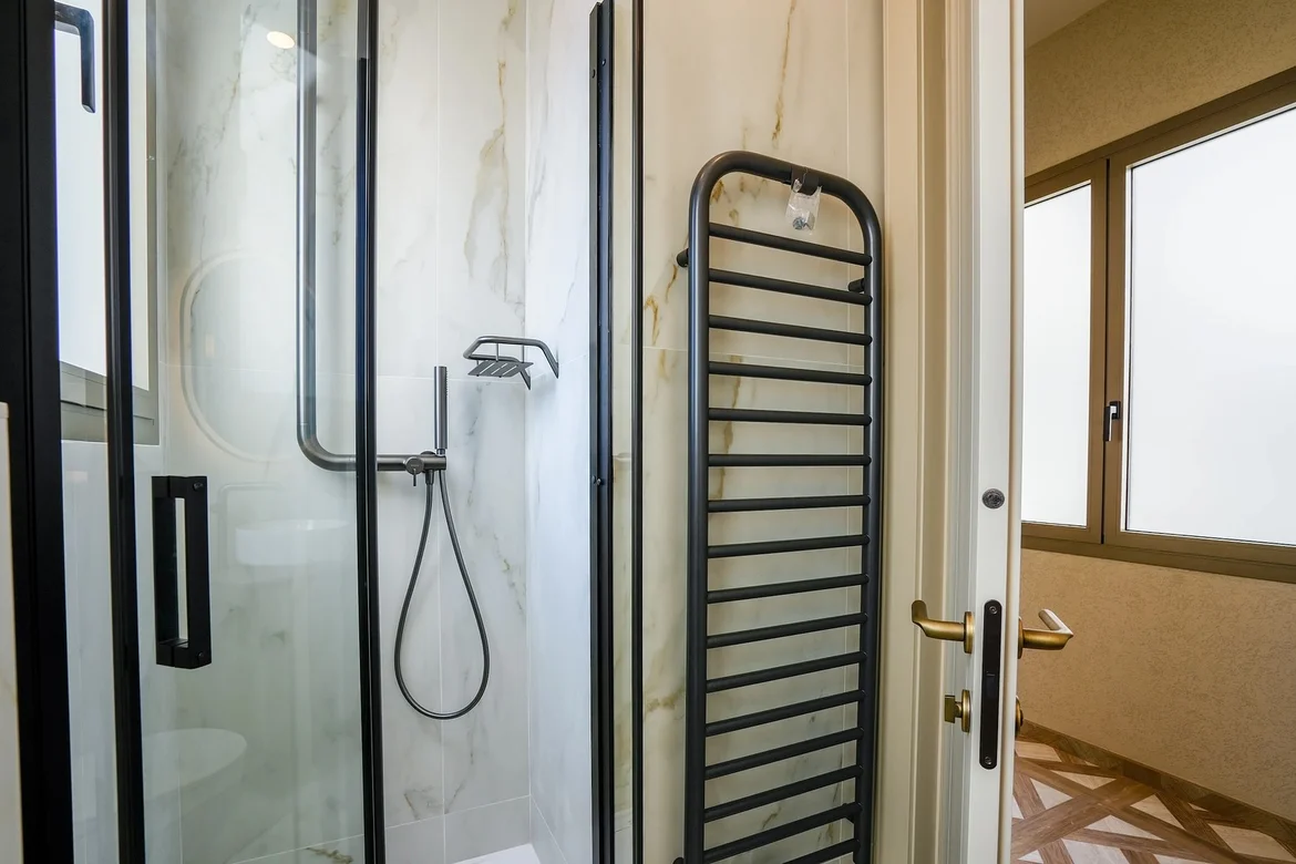 Mounted a modern matte black towel radiator that functions as both a practical comfort feature and a decorative design element aligned with the bathroom’s fixtures. -