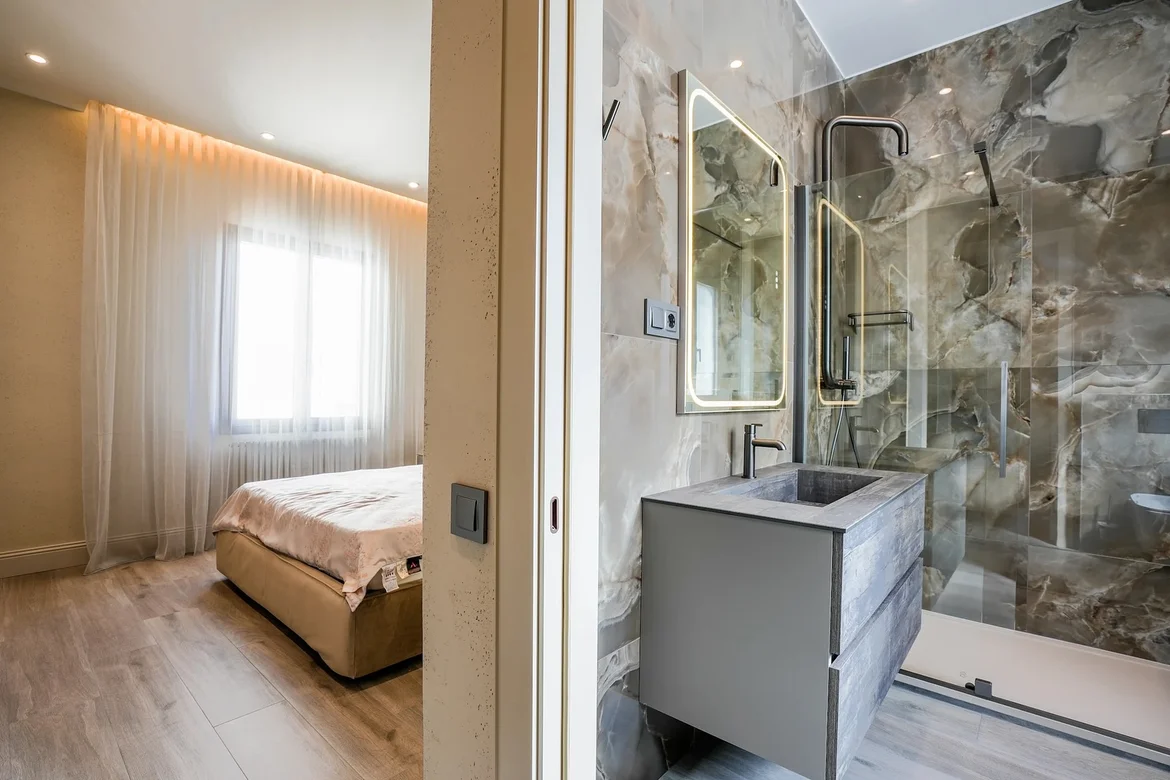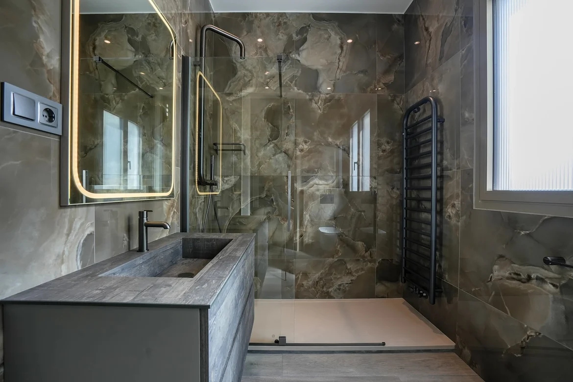 Installed large-format porcelain tiles with a subtle marble pattern on bathroom walls and floors. This choice visually expands the space while offering excellent moisture resistance and easy maintenance. -