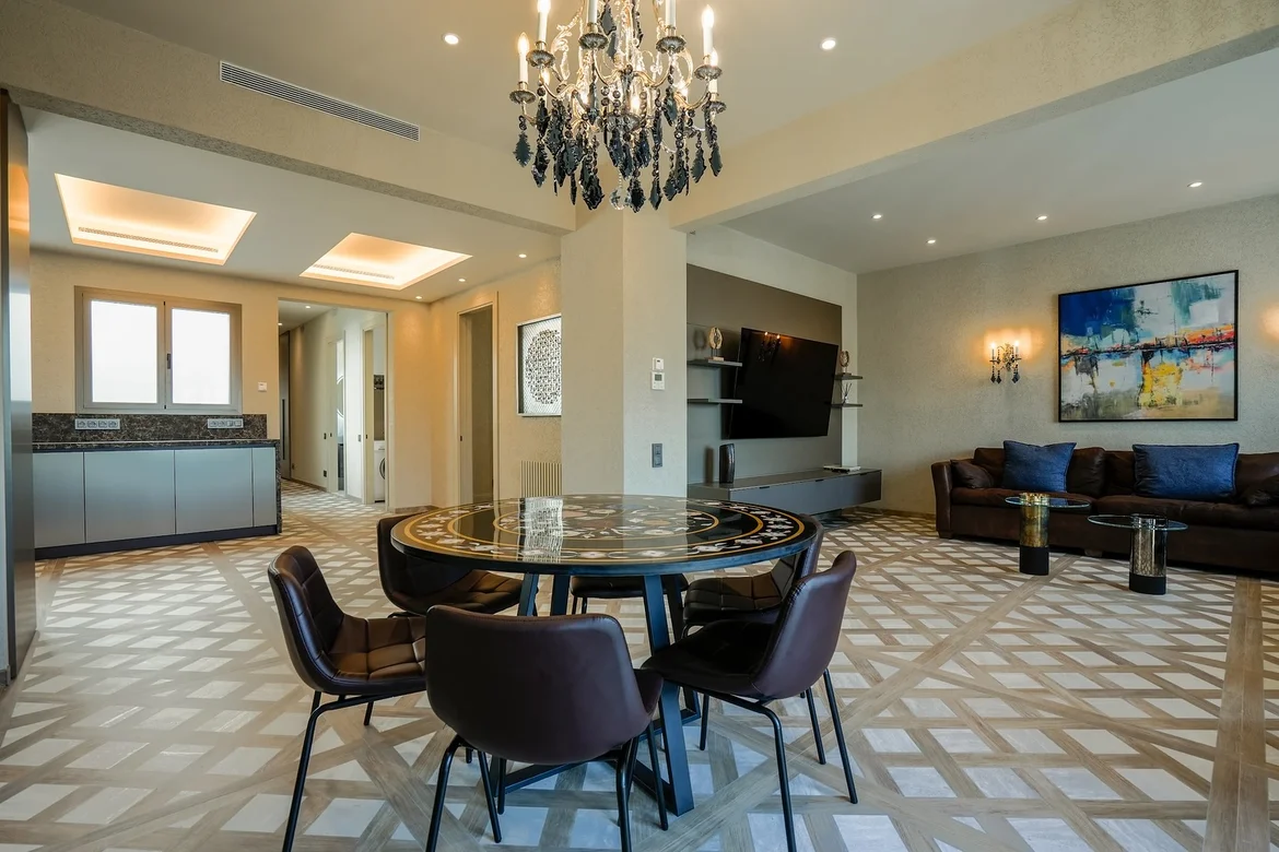 Implemented a layered lighting scheme combining recessed spotlights for general illumination, decorative chandeliers as focal points, and concealed ceiling lighting for soft ambient effects. -