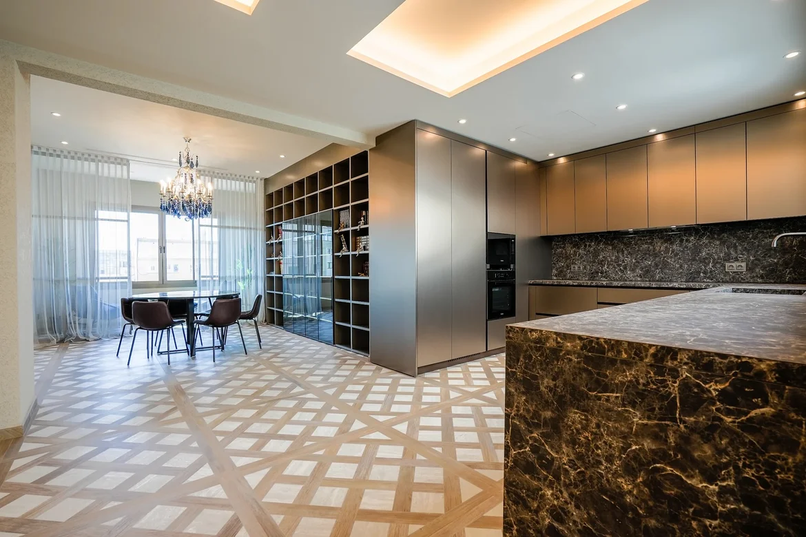 Installed statement flooring with a geometric pattern that defines the open-plan living and dining areas, adding character while emphasizing the architectural structure of the space. -