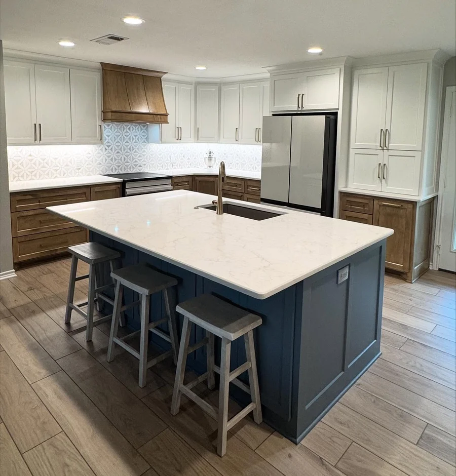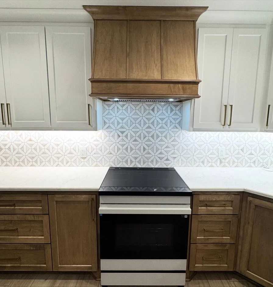 Applied a patterned tile backsplash that adds texture and subtle visual interest without overpowering the space. Precision installation and alignment ensure a refined, high-end finish. -