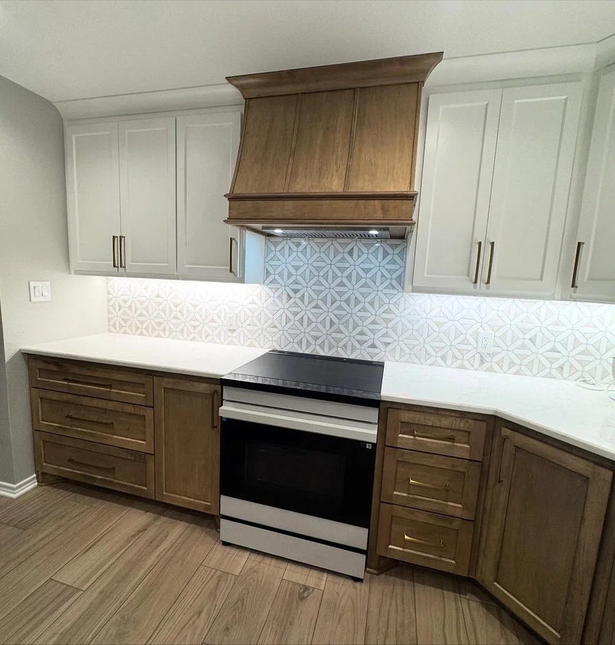 Crafted and installed a custom wood range hood that complements the lower cabinetry. This architectural feature anchors the cooking area while concealing ventilation components for a clean, cohesive look. -