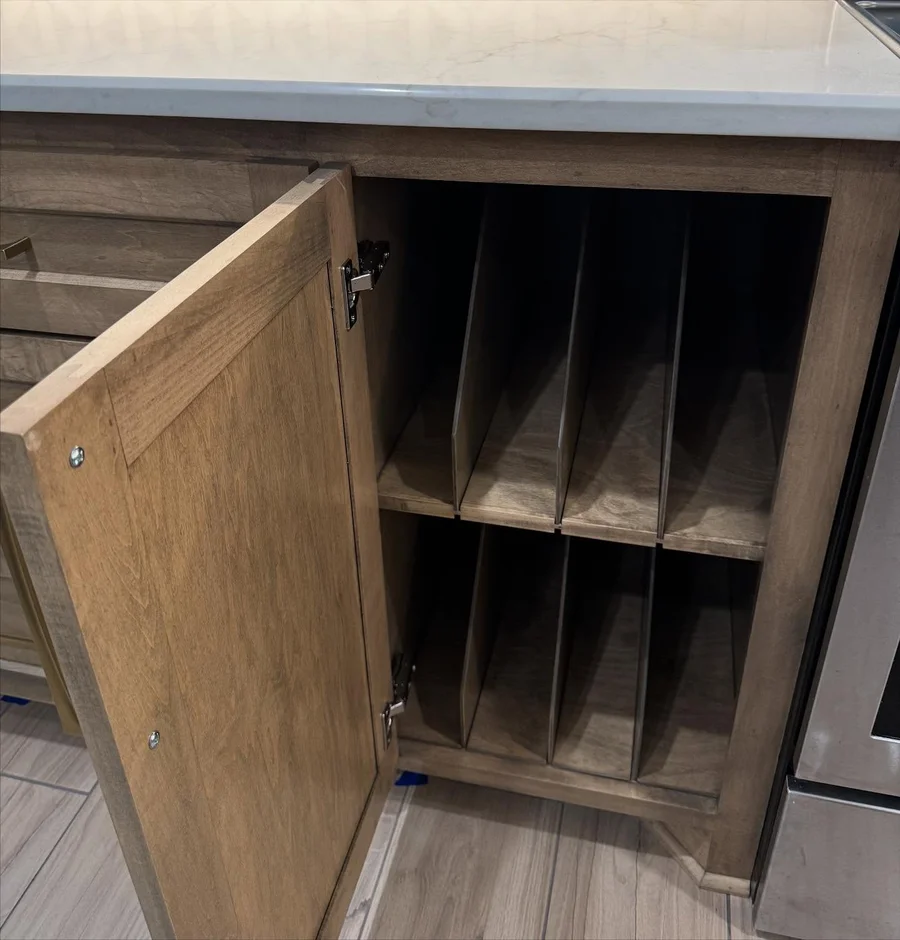Integrated custom interior organizers, including vertical tray dividers, deep drawers, and concealed storage compartments. These solutions improve accessibility and keep cookware, bakeware, and accessories neatly arranged. -
