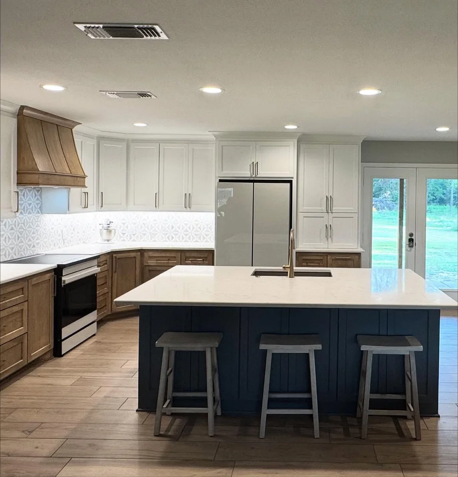 Built a large central island with contrasting cabinetry color, ample seating, and integrated storage. The island serves as a multifunctional hub for food preparation, casual dining, and entertaining. -