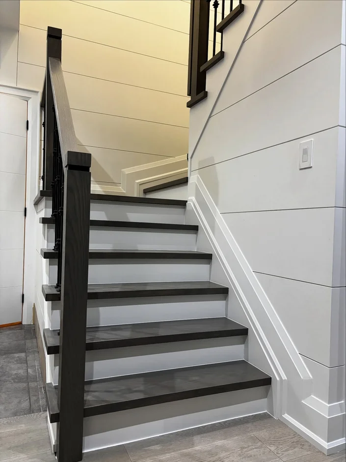 Installed solid wood stair treads with painted risers for durability, visual contrast, and long-term wear resistance. -