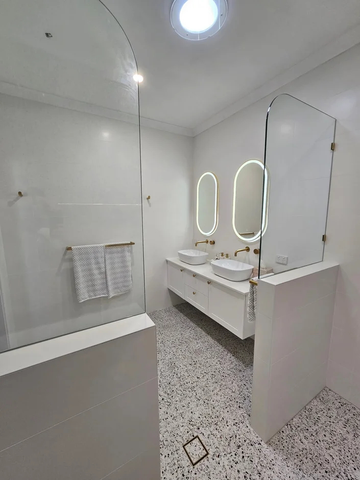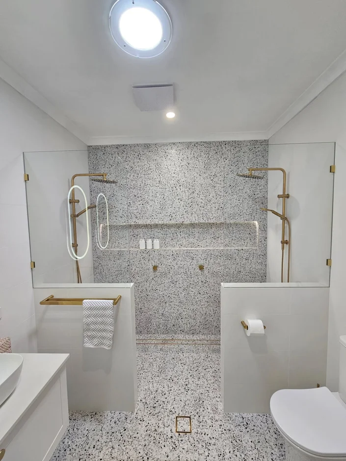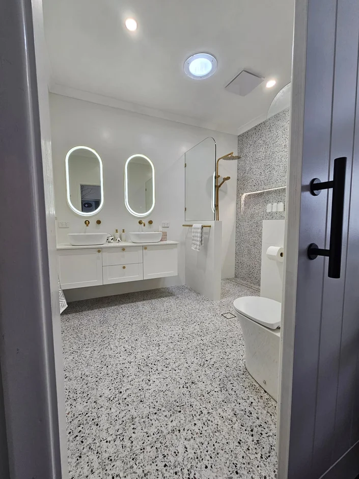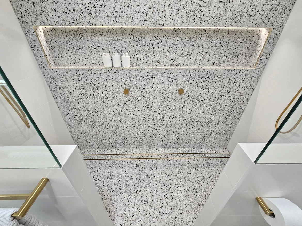 Installed terrazzo-style flooring throughout the bathroom and extended it onto the shower feature wall to create visual continuity and a durable, slip-resistant surface. -