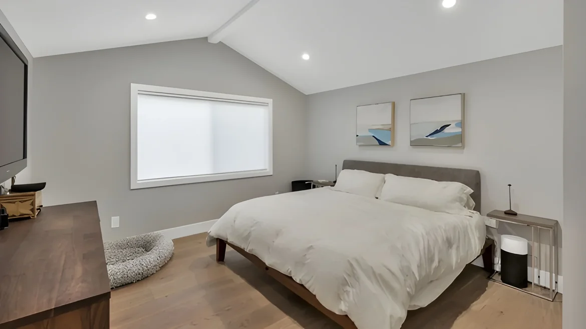 Reimagined the primary bedroom with calming tones, minimalist décor, and new recessed lighting to create a tranquil sanctuary. -