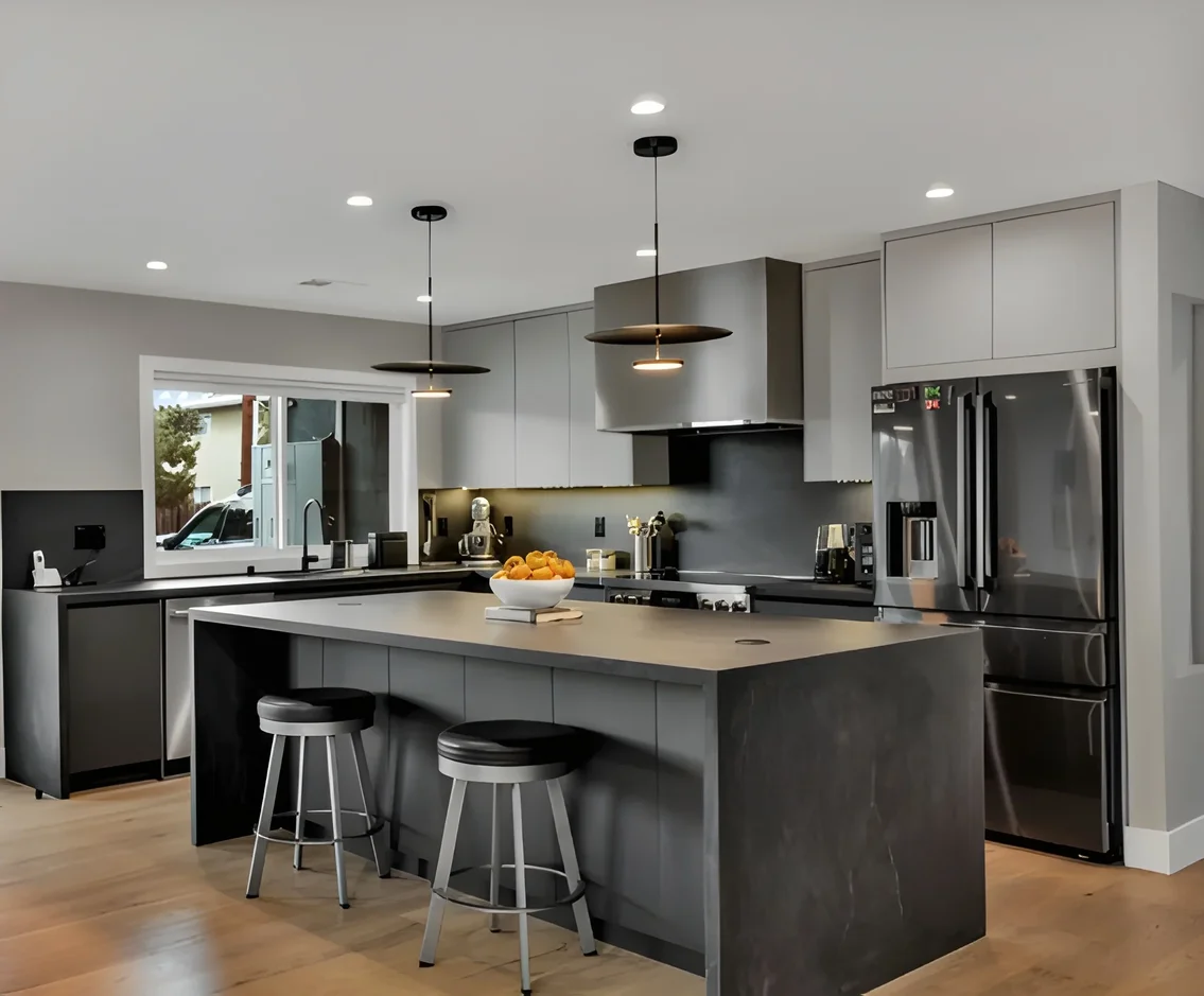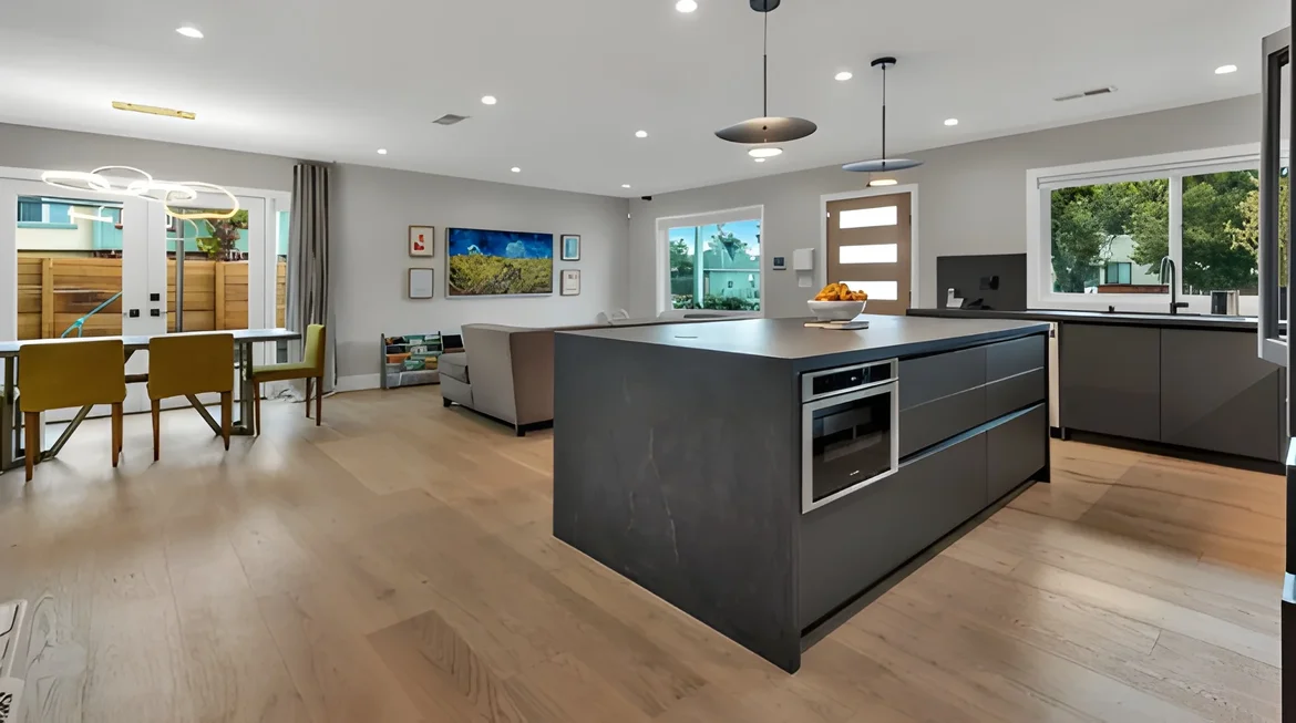 Installed a sleek, open-concept kitchen featuring a large stone island with integrated appliances, matte black fixtures, and custom cabinetry. The layout now encourages connection between the cooking, dining, and living spaces. -