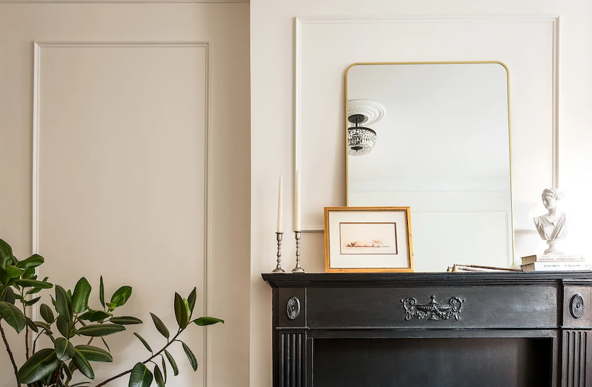 A thin-edged brass mirror above the mantel expands the room visually.