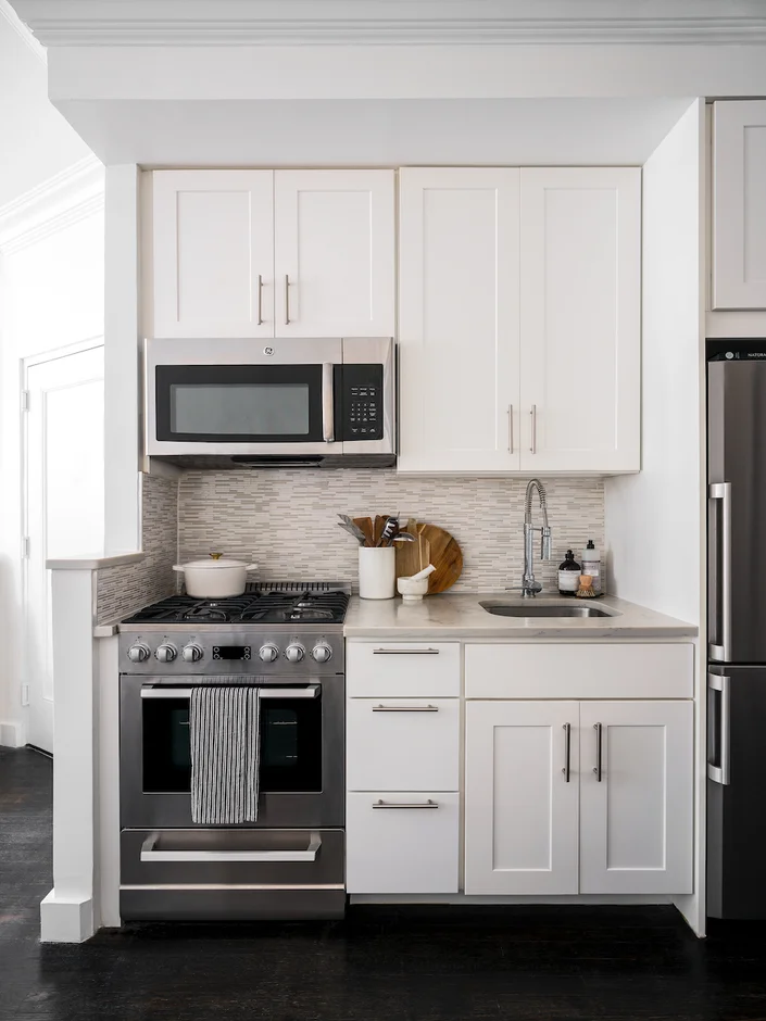 Replacing all cabinets with crisp white shaker-style millwork.