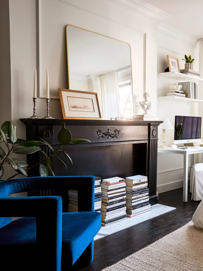 The mantel and surrounding shelves were styled with a curated mix of art, candles, and decorative objects.