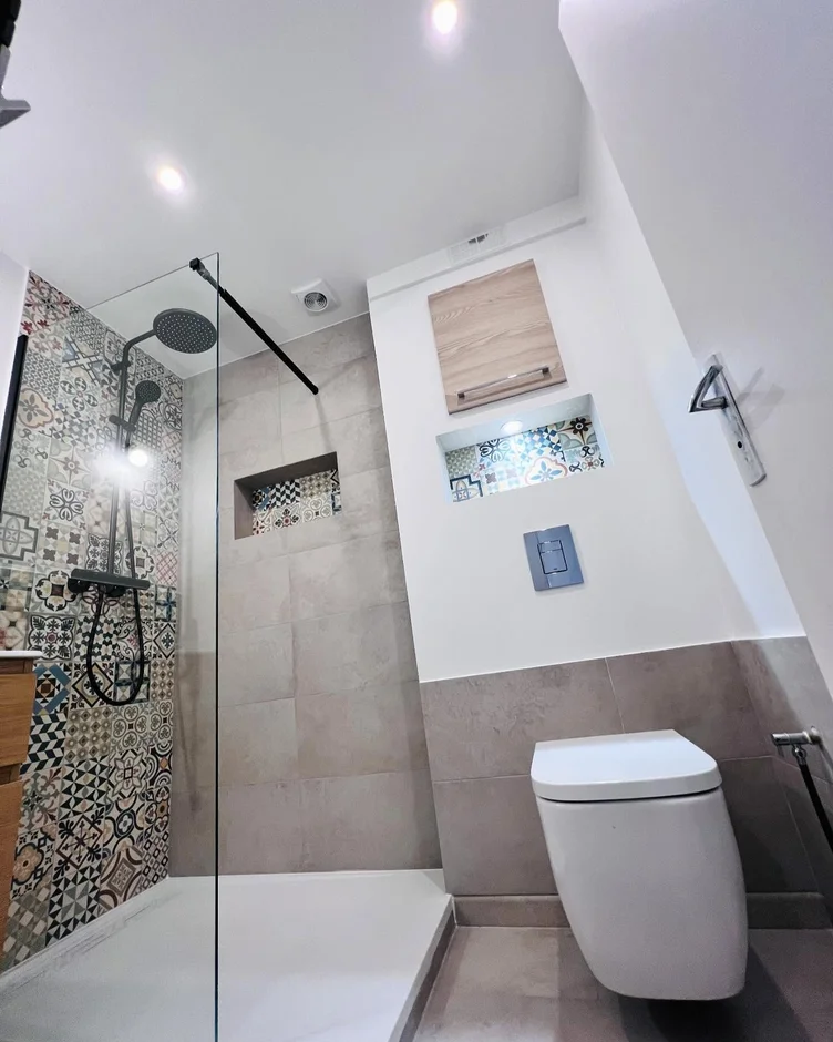 Added recessed wall niches inside the shower and above the toilet, finished with patterned tiles to offer both practicality and cohesive visual rhythm. -