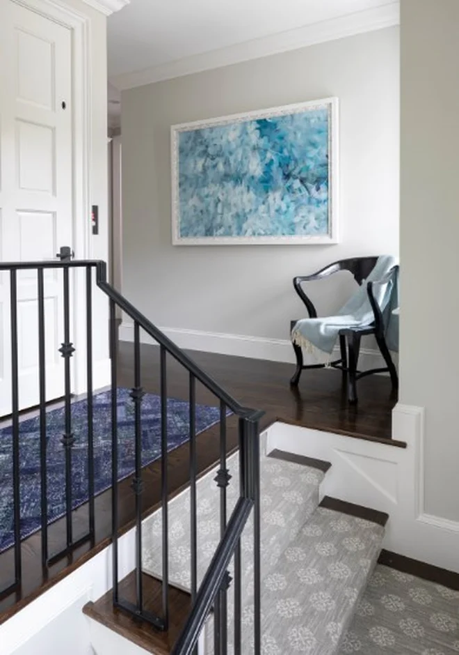 The stair landing was once dark and underutilized. We brightened the space with fresh paint, warm wood floors, updated railing, and custom artwork that adds energy and color. The redesigned layout creates a smooth visual transition between floors and adds a beautiful pause point in the home.
