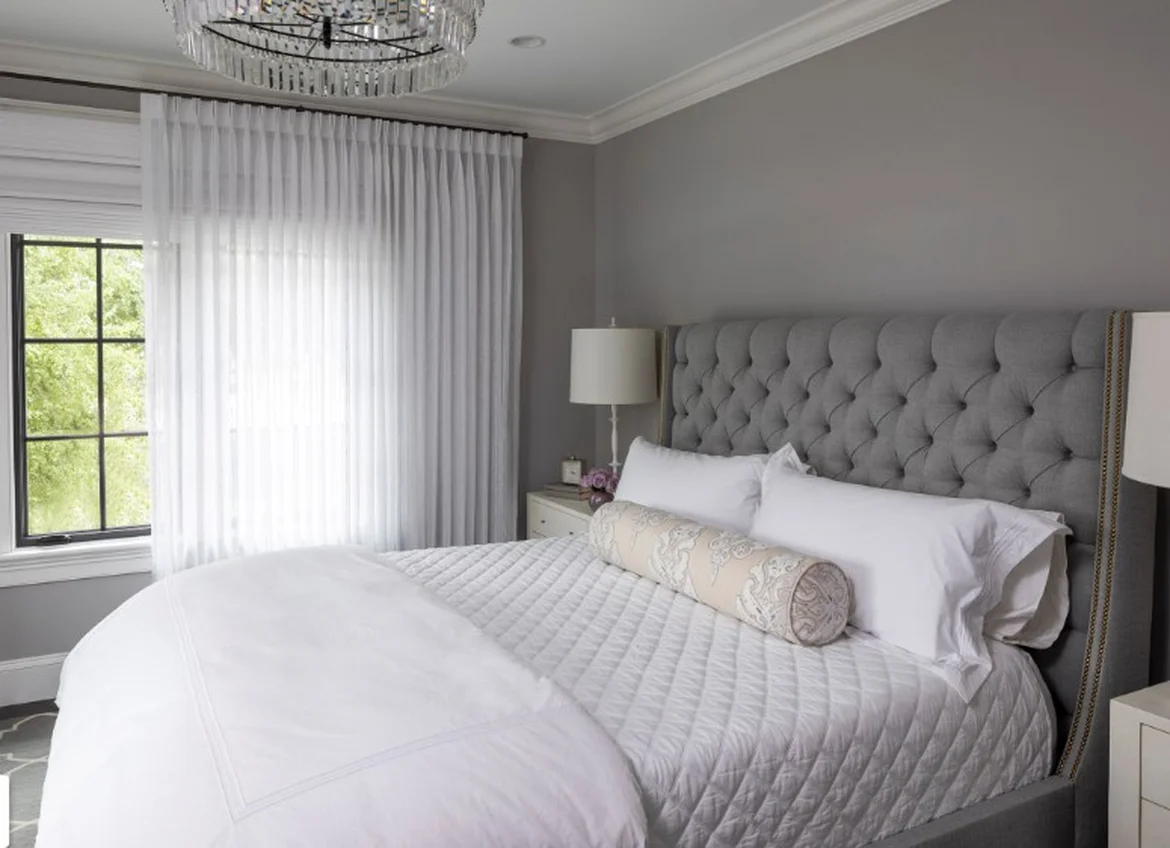 The bedroom had worn finishes and minimal character. We introduced a calming, sophisticated environment with soft grey tones, an upholstered tufted headboard, elegant drapery, and layered bedding. New lighting, including a statement chandelier, brought a sense of luxury and comfort.