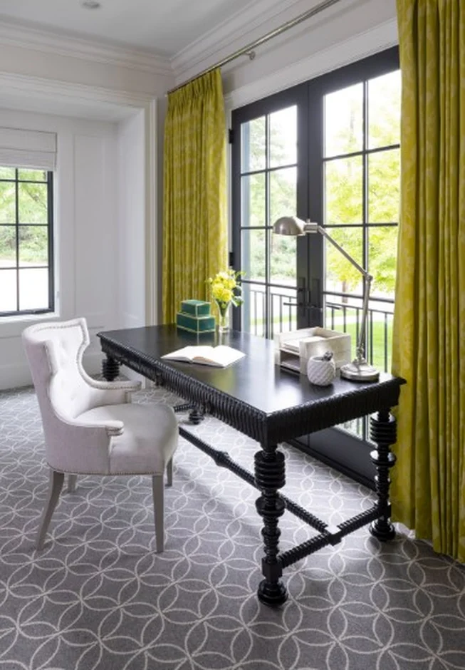 The office had limited functionality and little style. We upgraded it with a bold contrast of black furniture, patterned carpeting, and vibrant yellow drapery to energize the space. Large windows and improved lighting create a productive, inspiring environment for work.