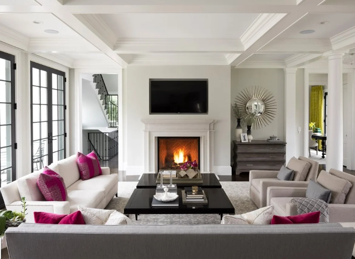 The living room underwent one of the most dramatic changes. Previously dominated by bulky finishes and poor furniture placement, it felt closed off and outdated. We opened the space, refreshed the architectural millwork, and added sophisticated coffered ceilings. Light furnishings, layered textures, and vibrant accent pillows in fuchsia tones bring life and personality. Large black-framed French doors now anchor the room, flooding it with natural light and connecting it visually to the outdoors.
