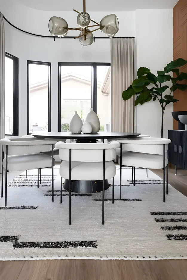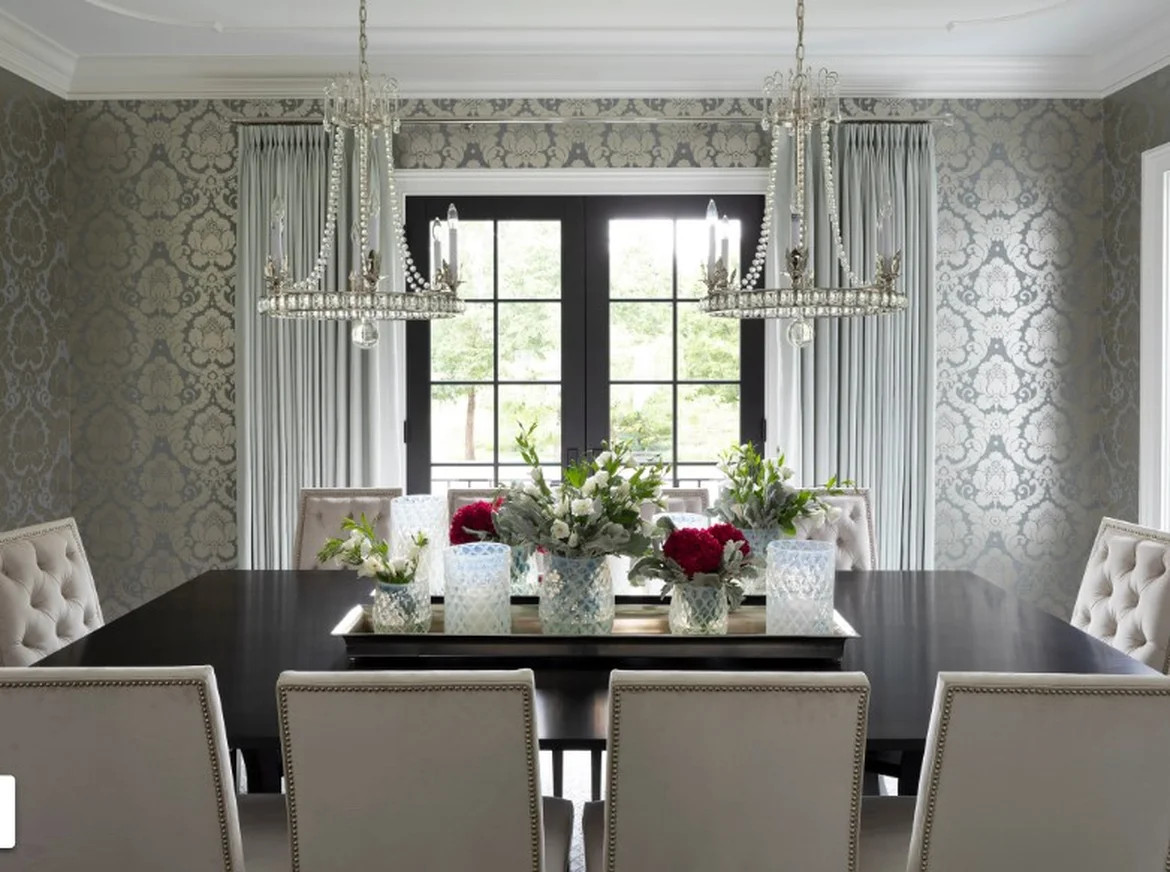 The dining room was once traditional and visually heavy. We refreshed it with soft wallcoverings, an elegant chandelier, comfortable modern seating, and a sophisticated palette. The space is now perfect for hosting gatherings in a refined yet inviting atmosphere.