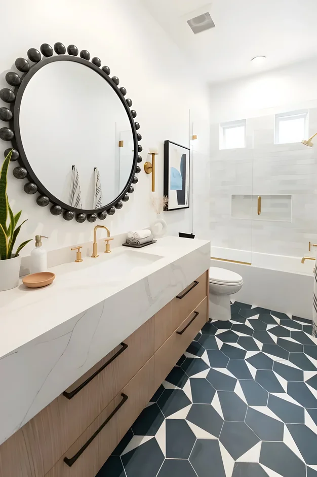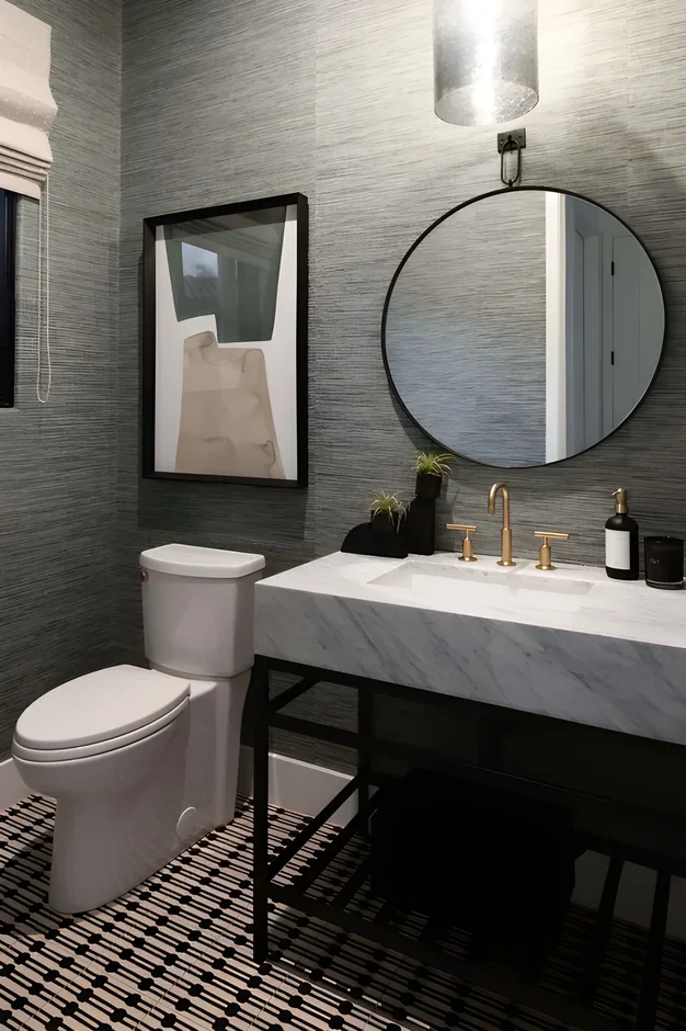 The primary bathroom was originally cramped and visually cluttered, with outdated tile and poor natural light. We redesigned the entire space with a spa-inspired palette: marble flooring, a frameless glass shower, a freestanding soaking tub, and black-framed windows that bring in crisp contrast. Soft grey walls, polished fixtures, and layered lighting complete the serene, hotel-like atmosphere.