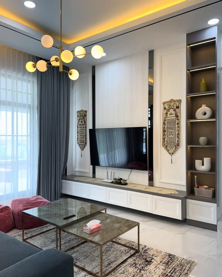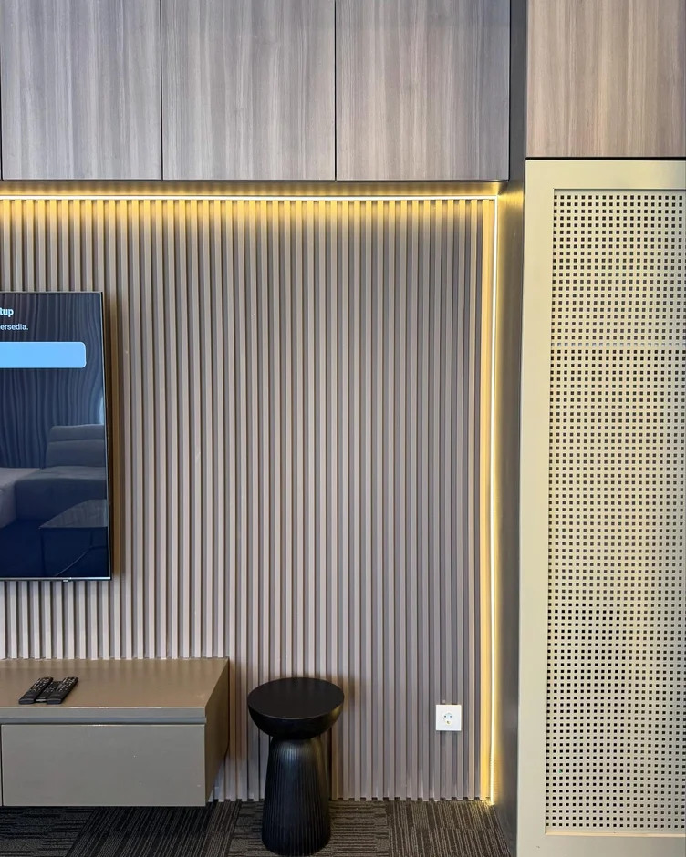 Built modern TV feature walls with vertical panels, integrated LED backlighting and floating cabinetry to add texture, focus and visual sophistication.