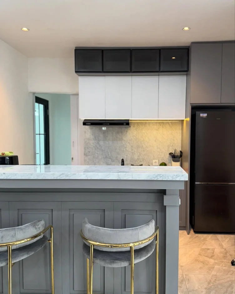 Installed custom two-tone cabinetry, marble-look countertops and a full stone backsplash. Added a functional bar with stylish seating and modern appliances for a polished, contemporary workspace. -
