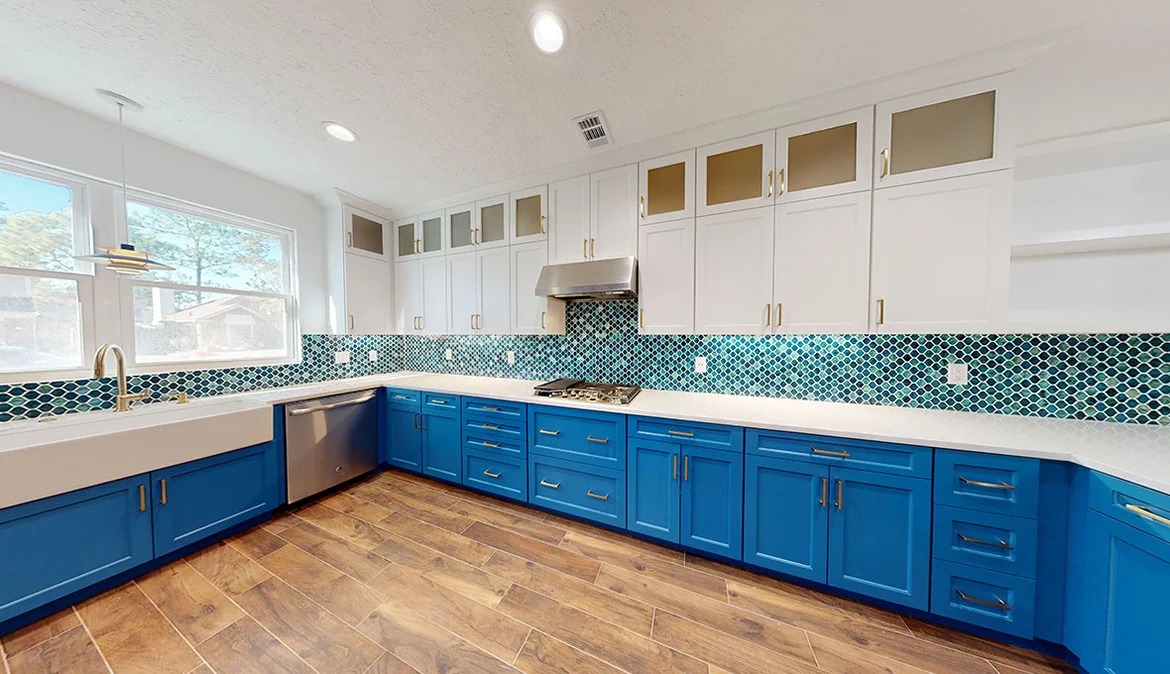 The finished kitchen is bold, bright, and highly functional. The contrast between blue cabinetry, white surfaces, and textured tile creates a dynamic yet timeless design. Custom finishes and thoughtful layout improvements ensure the space works just as beautifully as it looks.