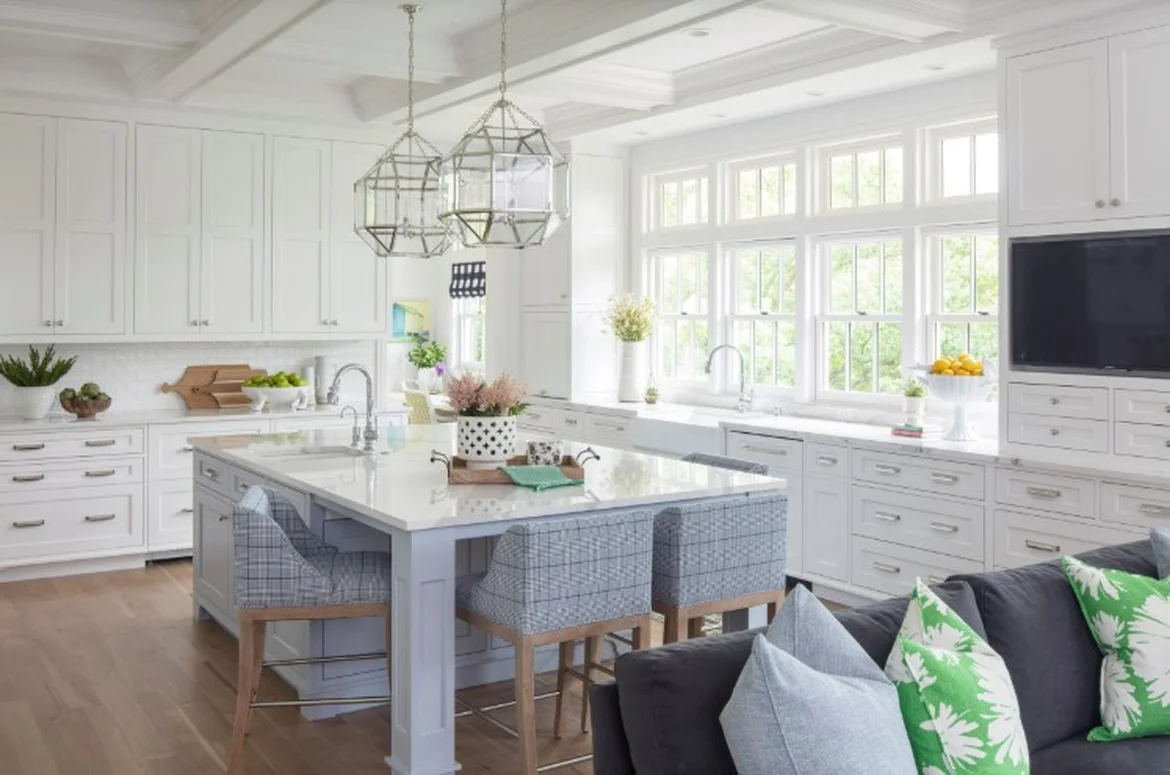 Classic Cabinetry with a Modern Twist: We installed crisp, white cabinetry that provides a clean and timeless foundation. The space is anchored by a stunning central island, painted in a soft blue and paired with charming gingham-patterned seating, creating a perfect spot for casual meals and conversation.