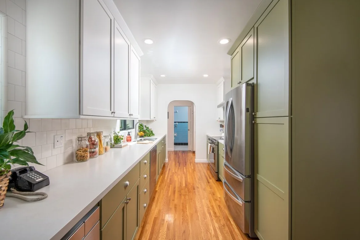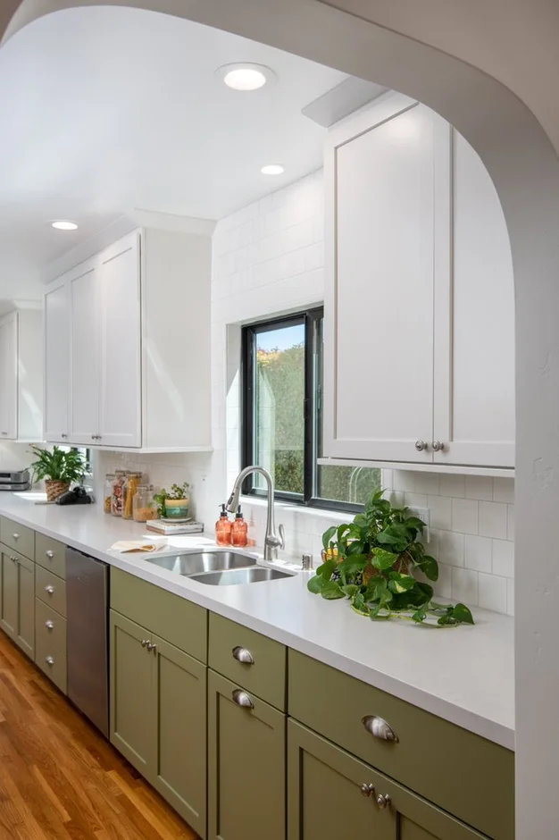 Custom shaker-style cabinetry was installed, featuring a two-tone design with white upper cabinets and soft green lower cabinets. The new layout offers improved storage, better organization, and a clean, timeless look.