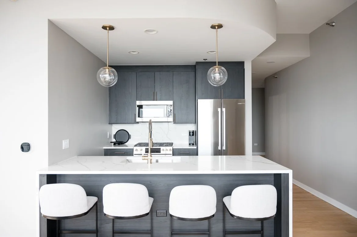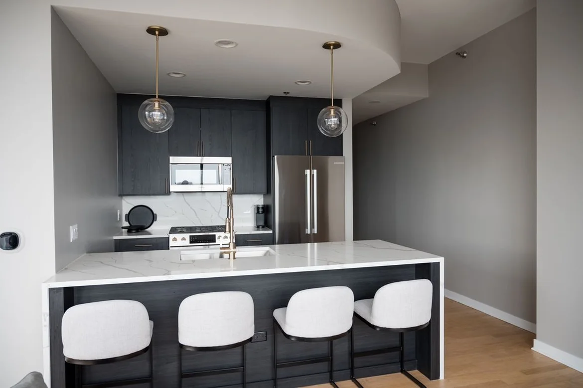 Premium marble-veined quartz countertops were installed throughout the kitchen, including a large center island with waterfall edges. These surfaces offer durability, low maintenance, and a refined modern aesthetic.