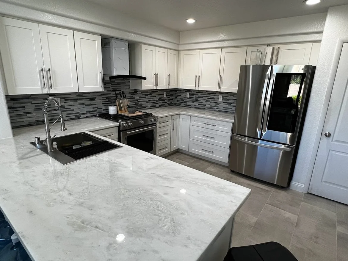 A light marble-look quartz countertop was installed, offering a durable, low-maintenance surface with a refined, high-end appearance. The seamless design enhances both functionality and visual appeal.