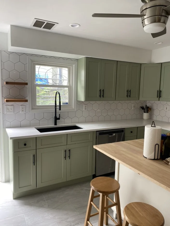 New shaker-style cabinets were installed throughout the kitchen, finished in a soft sage green tone. The cabinetry features soft-close doors and drawers, along with modern matte-black hardware for a clean, contemporary appearance and improved storage functionality.