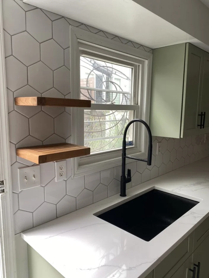 A full-height hexagon tile backsplash was installed across all work areas. The light-colored tile enhances brightness, protects the walls, and adds texture and visual interest to the kitchen.