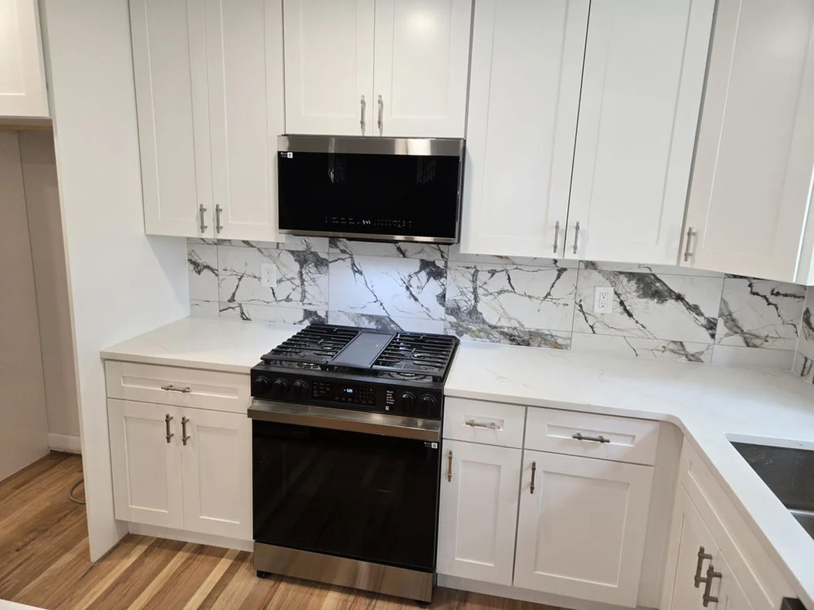The kitchen was equipped with modern stainless-steel appliances, including a gas range, built-in microwave, and dishwasher. A contemporary undermount sink and sleek faucet were installed for improved functionality and ease of use.