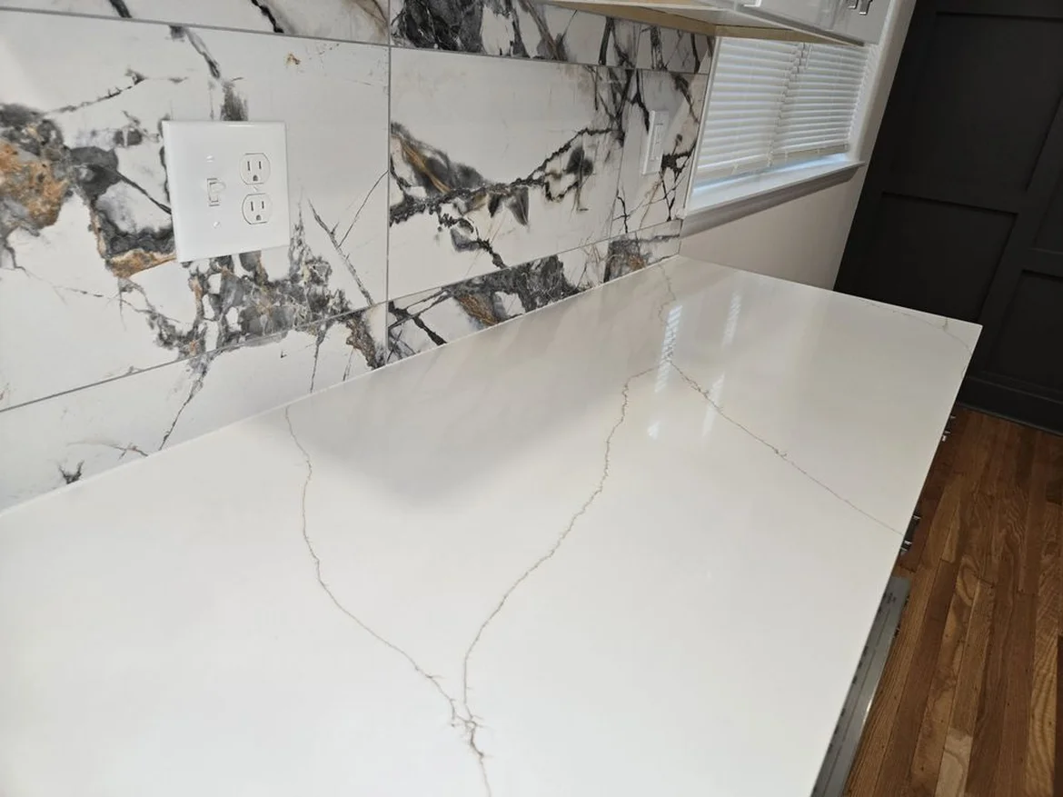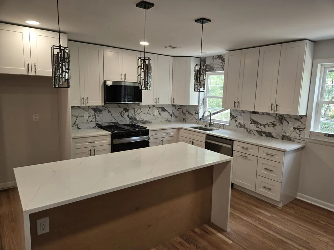Marble-look quartz countertops were installed along all work surfaces, including a large central island. The island adds valuable prep space, additional storage, and serves as a functional focal point for gathering and dining.