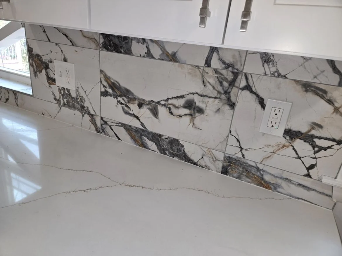 A full-height marble-pattern backsplash was installed across the cooking and prep areas. This upgrade protects the walls while adding visual depth and a cohesive connection between the cabinetry and countertops.