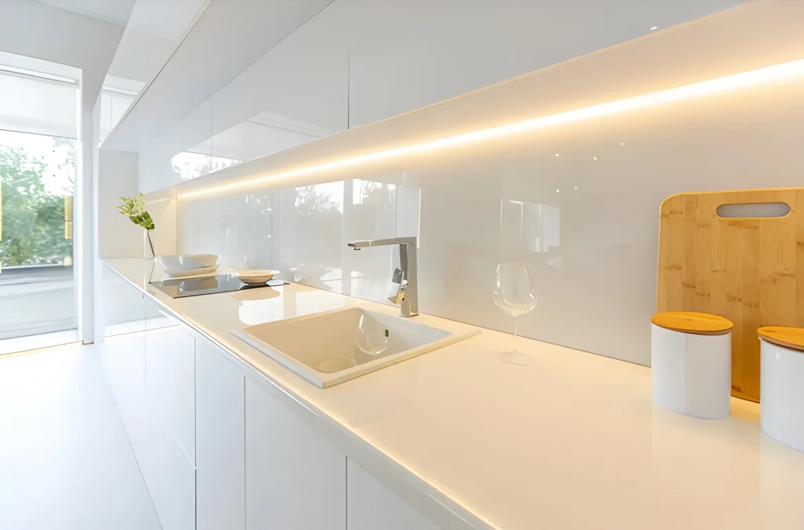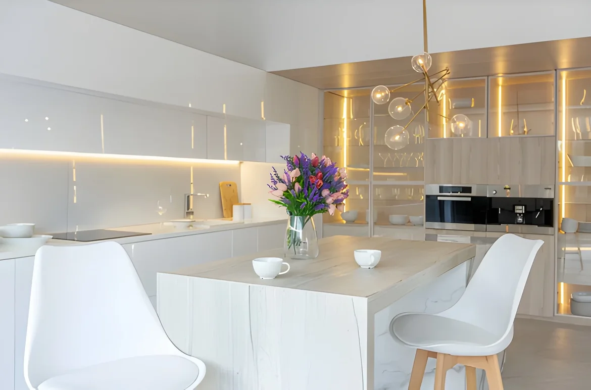 Installed sleek high-gloss white cabinetry with integrated handles for a clean, contemporary look. -