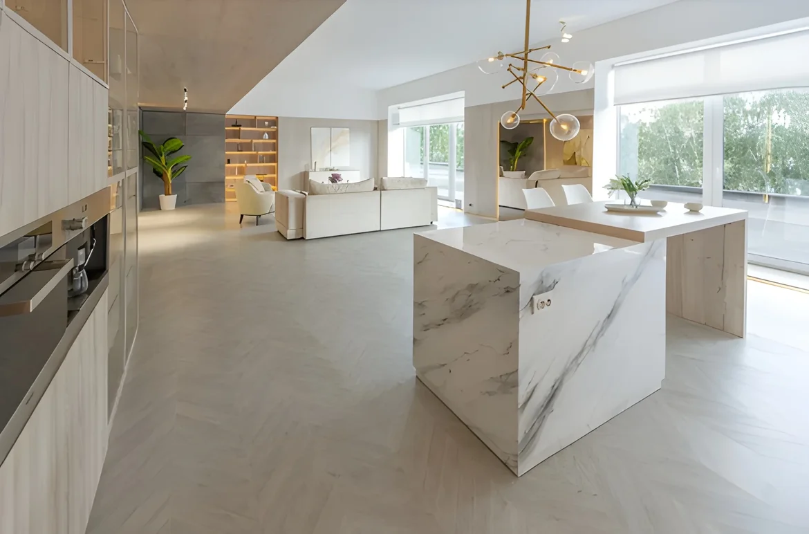 This project transformed a dated, closed-off space into a bright, luxurious open-plan area blending modern minimalism with warm, inviting details— perfect for cooking, dining, and relaxing.
