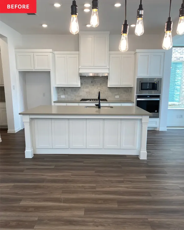 Replaced the original light fixtures with elegant brass pendant lights, each suspended from detailed chains for a sophisticated touch.