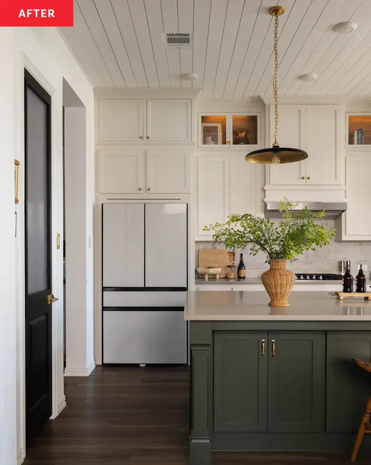 Refinished the island with a deep green, designer-grade paint for a striking contrast against the light cabinetry.