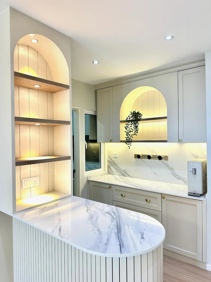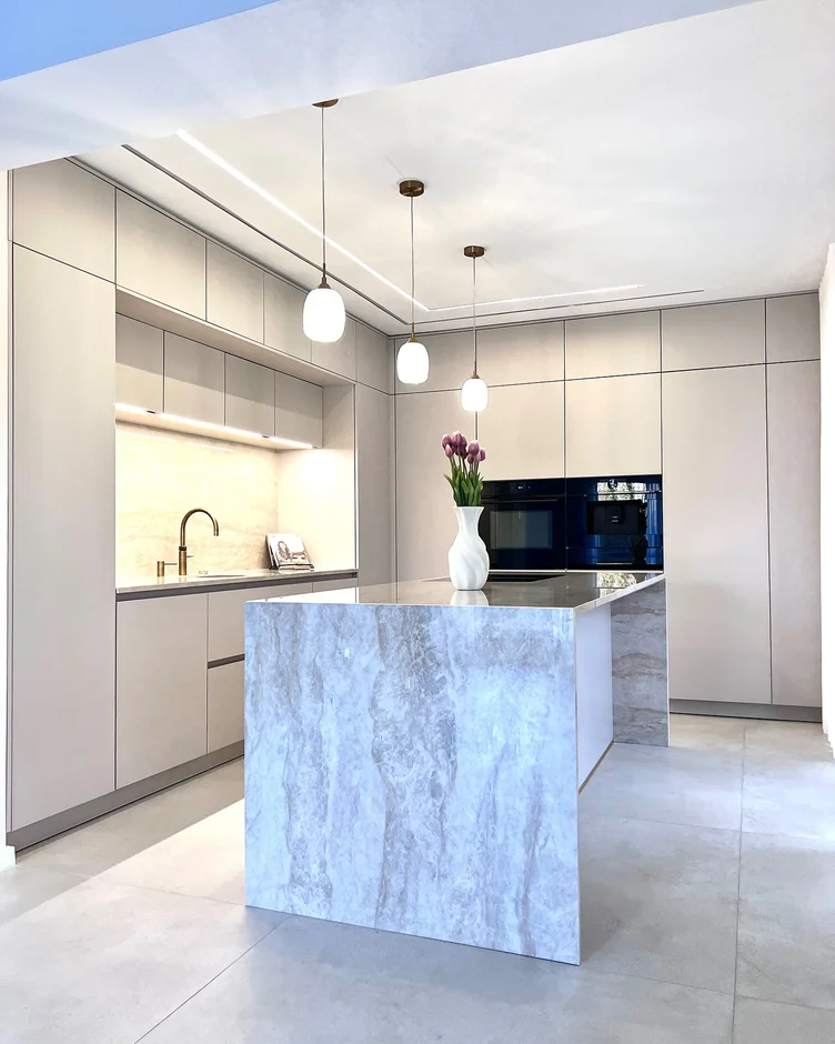 This renovation introduces a refined minimalist kitchen defined by clean architectural lines, soft neutral tones, and a striking stone island centerpiece. The design emphasizes seamless storage, integrated lighting, and a calm, modern atmosphere with high functionality for everyday use.