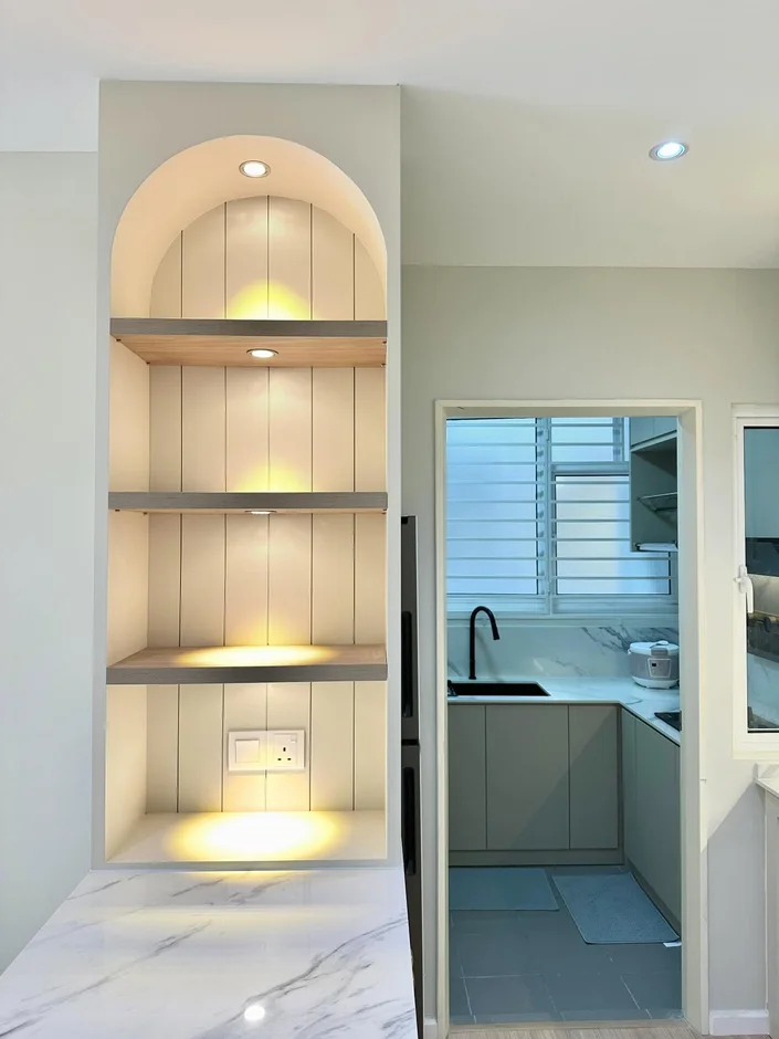 Added pendant lighting, recessed ceiling lights, and subtle linear illumination in the sink niche to enhance comfort, depth, and visual warmth. -