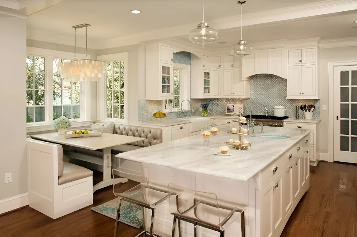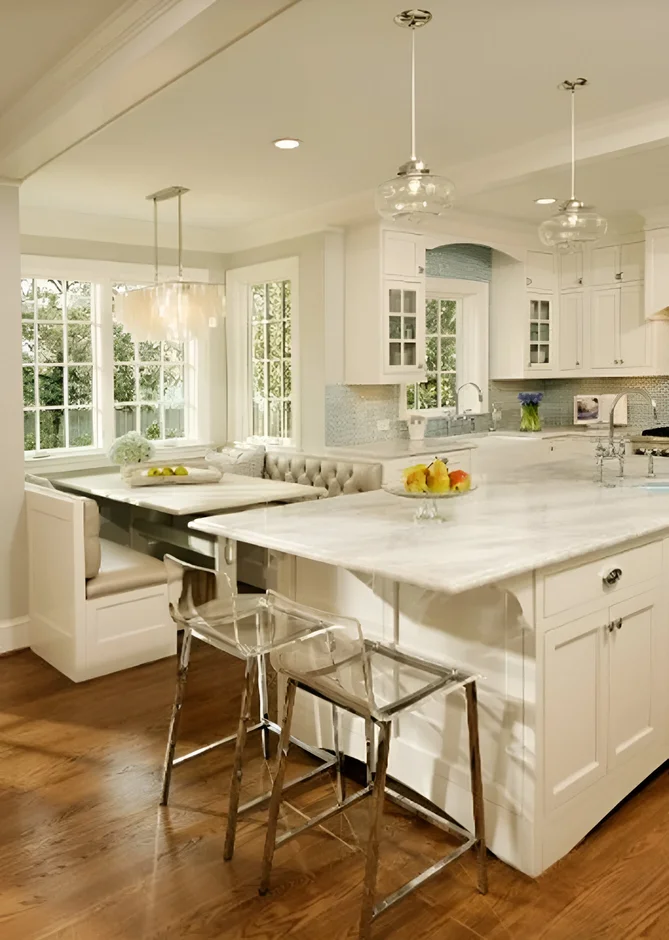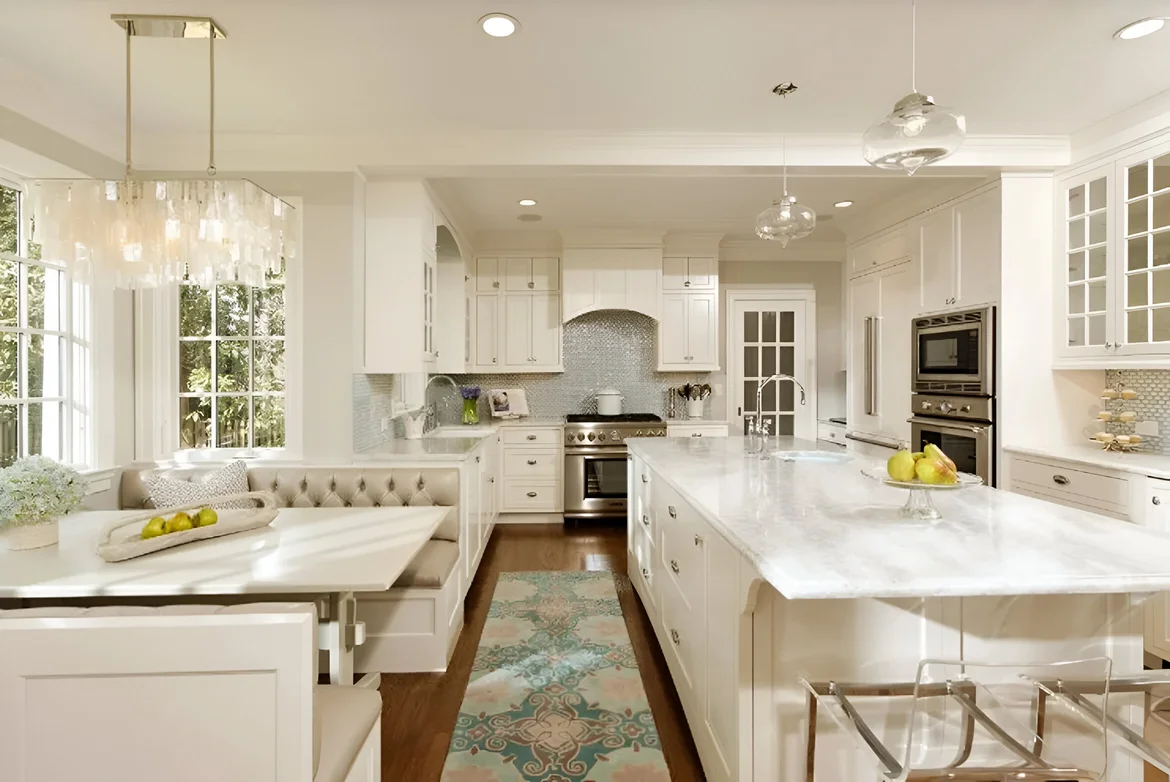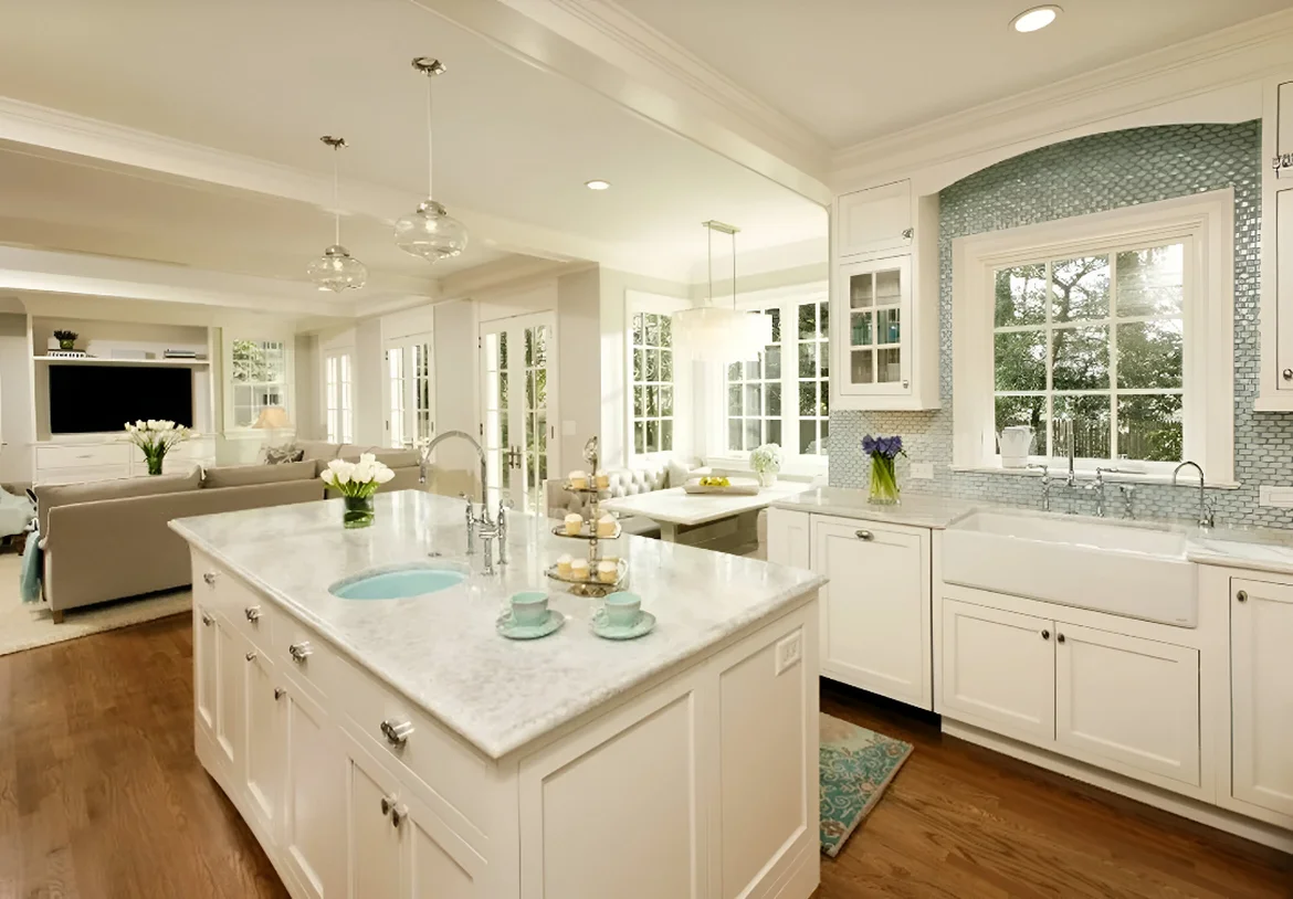 The kitchen is now an airy, elegant centerpiece — bright white cabinetry, luxurious surfaces, and thoughtful details create a space that feels both classic and fresh, ideal for family meals and entertaining.