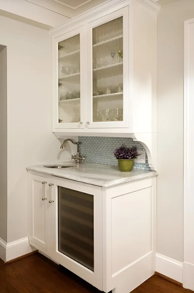Installed custom white shaker-style cabinetry with glass-front uppers and polished nickel hardware.
